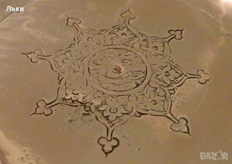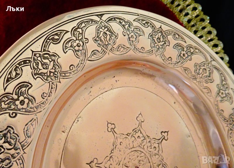 Древна персийска чиния,пано,изработена от ръчно кована масивна мед.Декорирана с разкошни орнаменти,изваяни на ръка със сложния метод наречен чеканка.В центъра на чинията,обградена от орнаменти има красива калиграфия.Чинията има над 300 годишна история,изработена с несъвършени инструменти,но с любов от