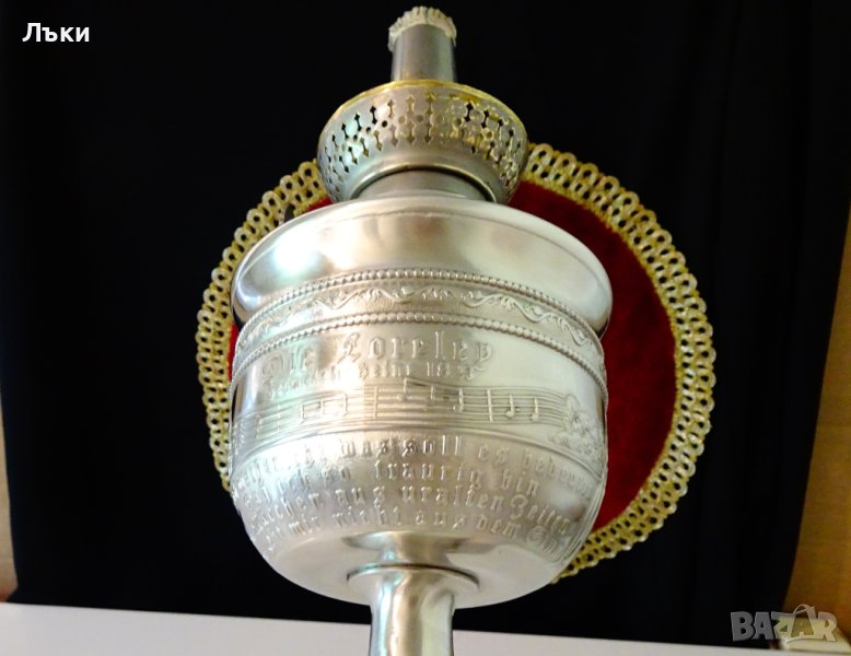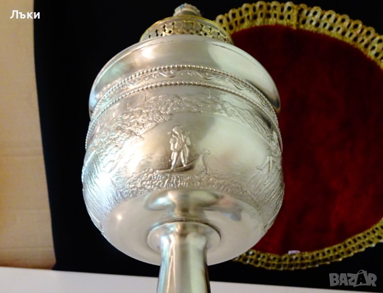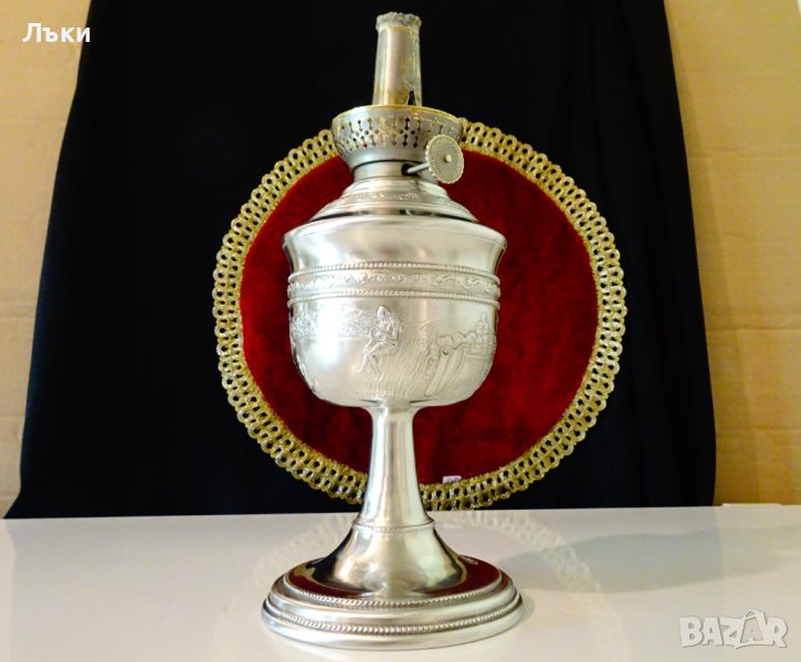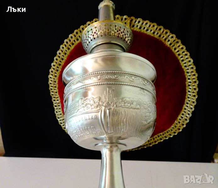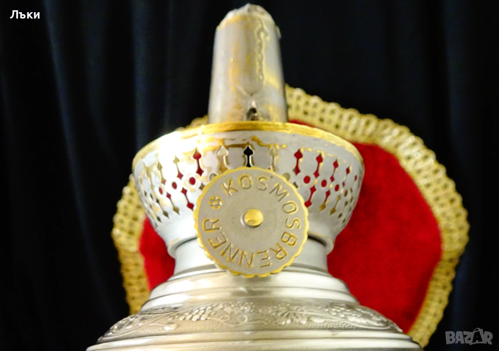Старинна немска калаена газена лампа,газова лампа с механизъм на световно известната марка Кosmos-Вrenner.Корпуса на лампата е изработен от 95% калай и 5% сребро,маркиран със знак за високо качество.Декориран с релефна картина