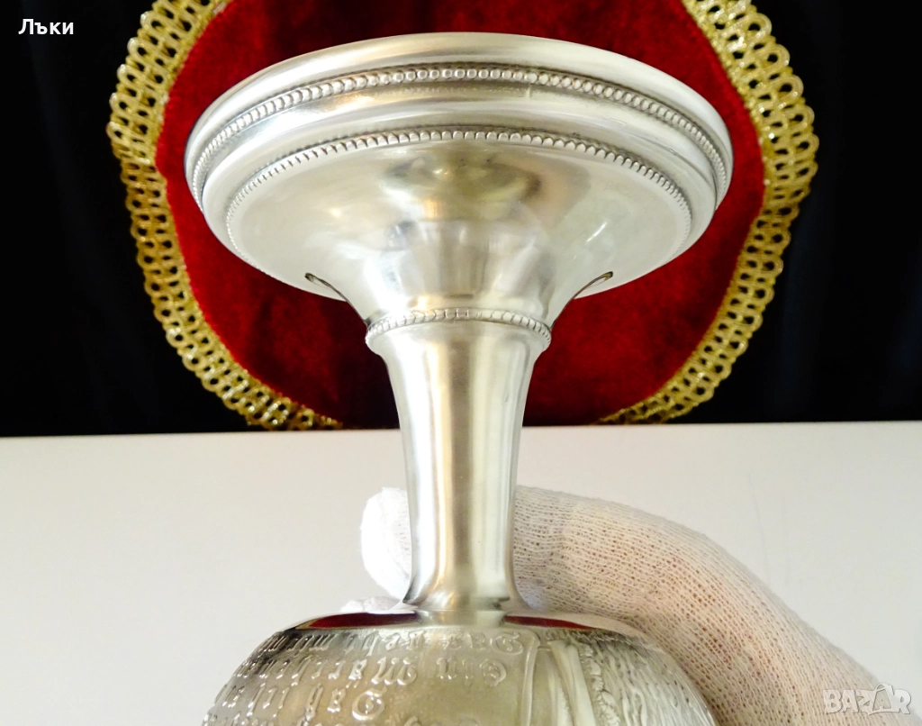Перфектно състояние със сребърен блясък.Лампата не е ползвана.Височина със стъклото 32.5 см.,височина без стъклото 26 см.,диаметър 10.5 см.,тегло 610 гр.