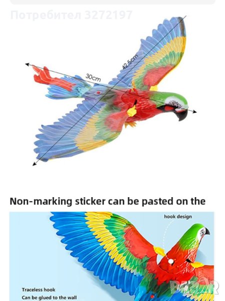 Просто завържете единия край на включената връв към куката на гърба на папагала, прикрепете другия край към куката, която може да се залепи за тавана, или използвайте висящо въже върху пластмасовата пръчка, за да закачите директно папагала, играчката е готова.