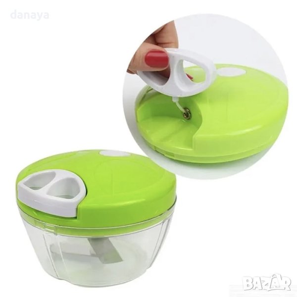 ръчен чопър ще ви помогне да режете зеленчуци, плодове, лук и чесън без миризма и без да разпилявате. С едно дърпане на връвта осигурявате 24 удара на ножовете върху продуктите. С този ръчен блендер не са ви необходими батерии, или електроенергия. Може да го използвате навсякъде – дори на къмпинг, пикник. Просто поставяте желаните продукти в чопъра и дърпате рязко въжето няколко пъти в зависимост от желания резултат. По този начин завъртате трите стоманени двойнозаточени ножове, които за няколко секунди ще разрежат продуктите едро или ситно.