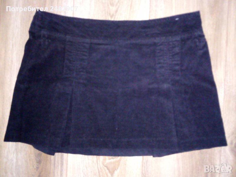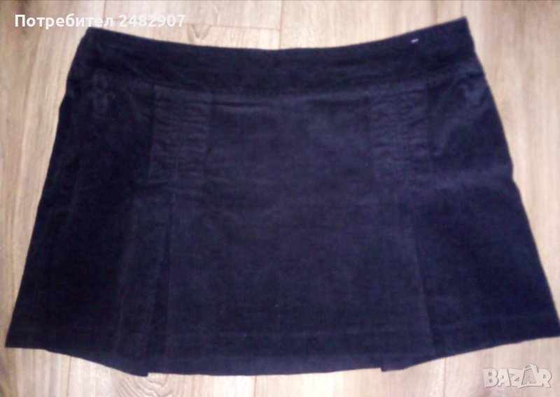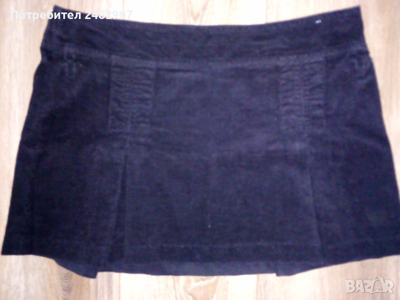Дамска джинсова пола в черно, размер S. Съдържа 100 % памук. Ширина в талията - 41 см, дължина от талията до долу - 33 см. Закопчаване - със страничен цип от лявата страна, с по две плохи отпред и отзад. Много запазена, почти не е използвана, без забележки.