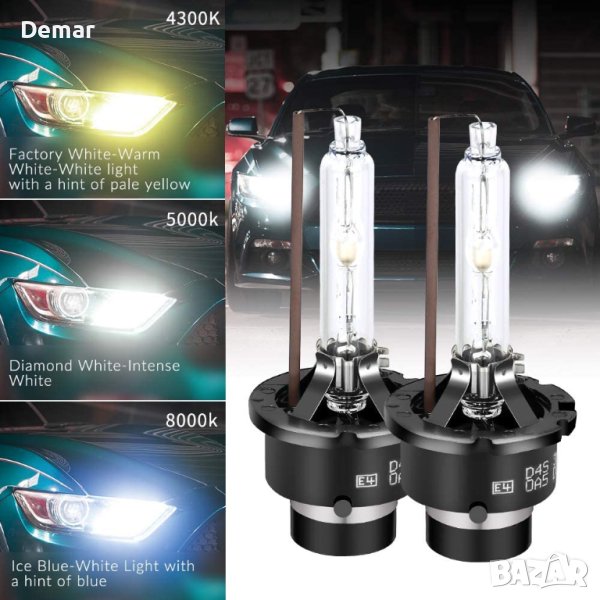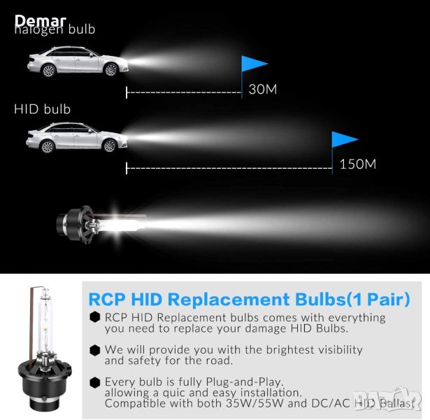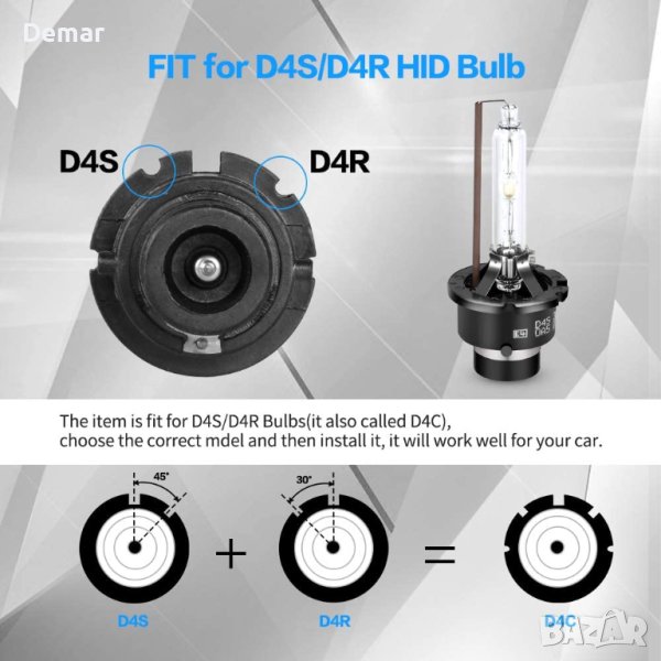 Опаковка от 2 броя Включва 2 бр D4S крушки. Plug and Play, спецификация на размера 1:1, без промяна на веригата, лесни стъпки за инсталиране. 85% от автомобилите, които използват HID крушки, също имат халогенни версии. Проверете отново типа фарове на вашия автомобил. В сравнение с традиционната 3200K халогенна лампа, 6000K светлина е по-ярка, супер фокус и висок лумен, без тъмни петна и сенки. Подобрете визуалното изживяване, като направите очите си по-комфортни, удобни за дълго шофиране през нощта.