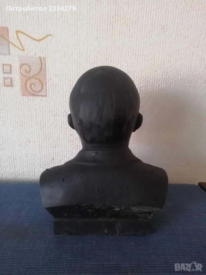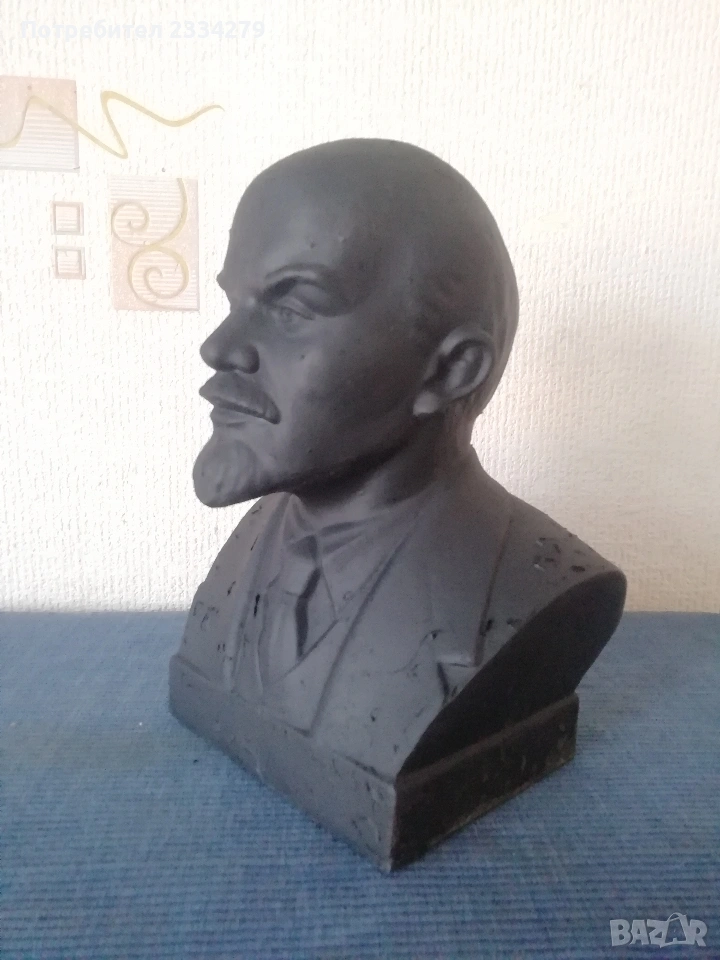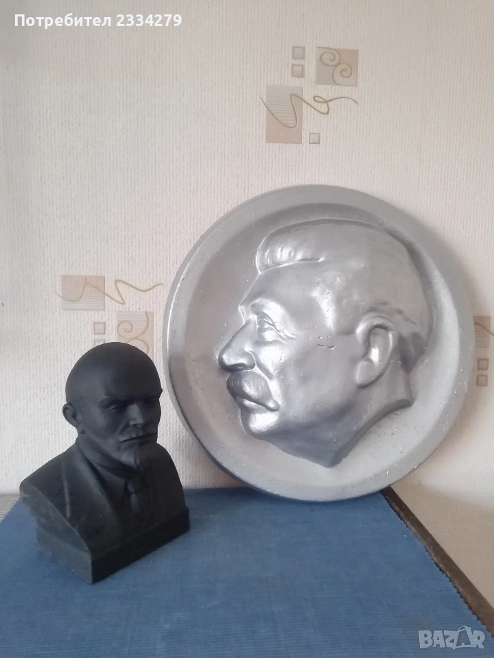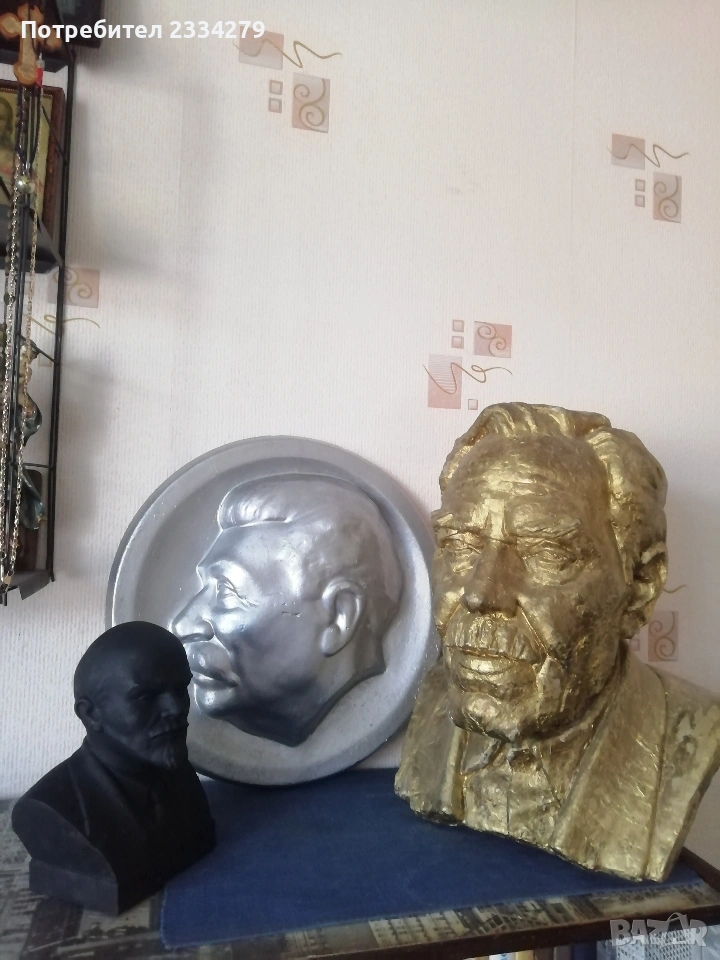 статуя,,Глава" ,авторска ръчна изработка от мраморен прах и гипсово лепило,размери: височина 45см., широчина 35см., цена 30€.; N:2 метална аломиниева бюст статуетка на руският водач на Октомврийската революция Владимир Илич Ленин, авторска отливка от 50-60те години, размери височина 21см., широчина17х15см., цена 25€.; N:3 барелеф гипсово пано с бронзов нанос, изобразяващ руският водач победител във втората световна война Йосиф Сталин, използвани за украса прес 50-60те години, закачани над бюра в партийни кабинети, зали учреждения, размер 40см., цена 23€.