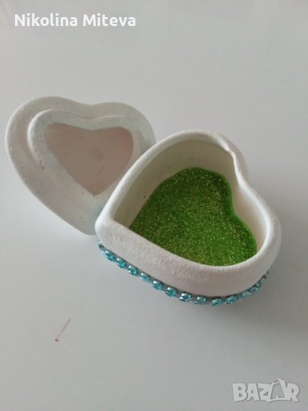 Кутийката е ръчно изработена с форма на сърце , гибсова, подходяща е за подарък. Размерите са : дължина 7 см , ширина 6 см, височина 5 см.