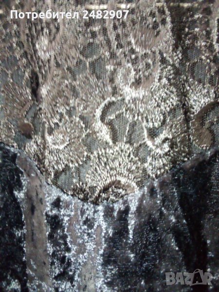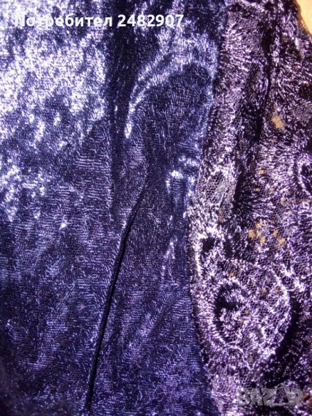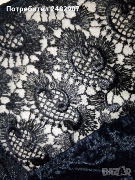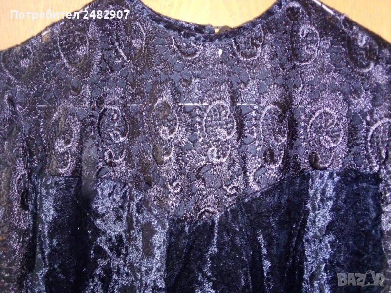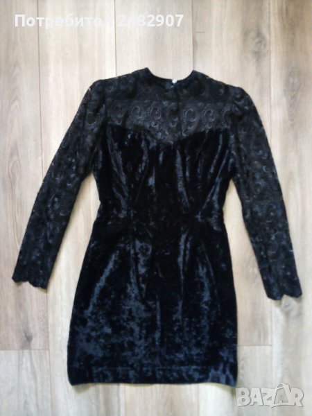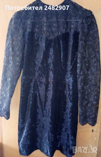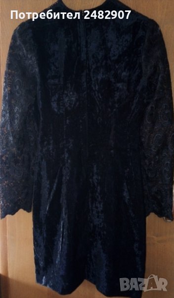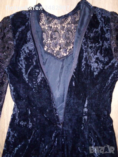 Официална къса дамска рокля от кадифе и дантела, размер XS. Ширина в раменете - 34 см, ширина под мишниците - 43 см, ширина в долната част - 46 см, дължина от рамото до долу - 79 см, дължина на ръкава от рамото - 55 см. Закопчаване - с цип и скрито копче на гъба. Обличана е веднъж за повод, много елегантна, вталена, без забележки.