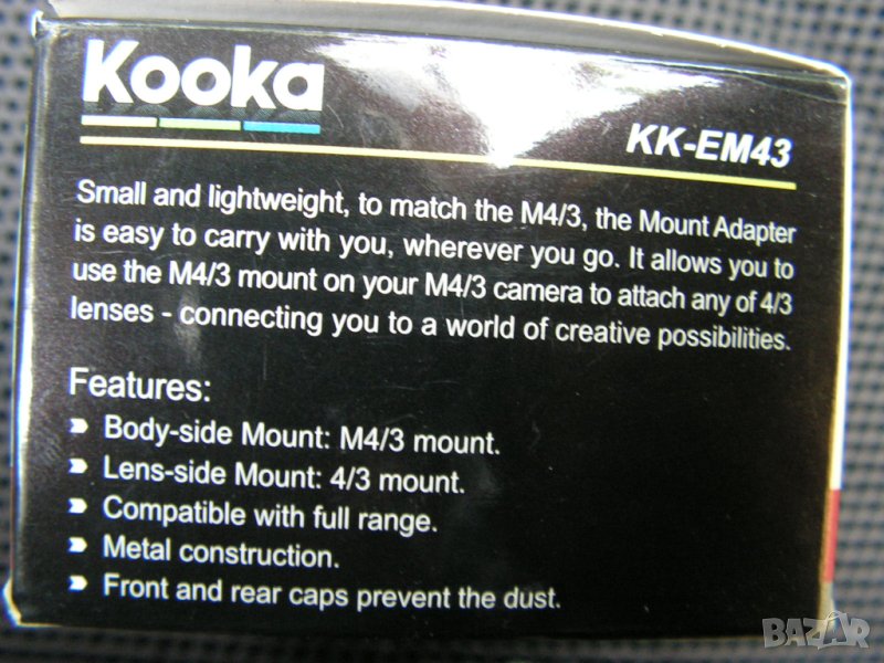 подробности можете да получите от мрежата, като изпишете в търсачка : ..Kooka kk-em43 Lens Adapter for Olympus Micro 4/3 Black..., или само ...Kooka kk-em43.. . Вижте внимателно подробните снимки, които съм приложоил в обявата. В София може и лично предаване. Работя с „Еконт“.