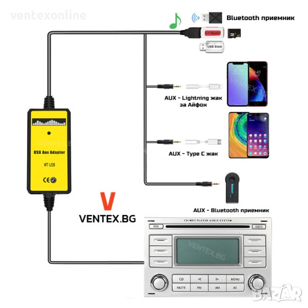 Aдаптера ви позволява да свържете смартфона към радиото чрез AUX или чрез Флашка , карта памет и да възпроизвеждате музика през високоговорителите на автомобила.