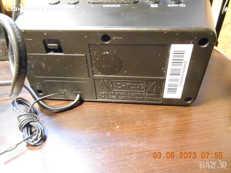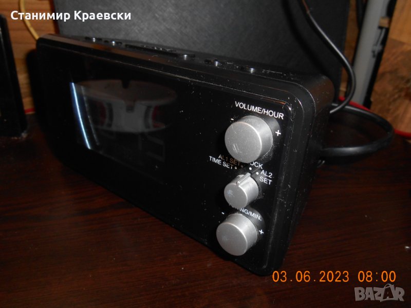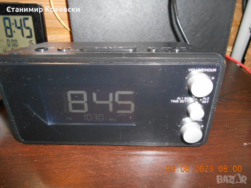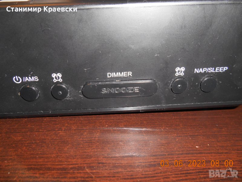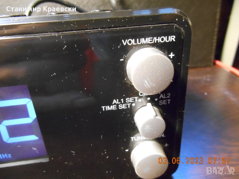 Радиочасовника работи без забележки На места има дръскотини Страничен говорител 2 аларми Димер на дисплея - светло - слабо и изк PLL тунер Става за хора без претенции към външен вид Всички копчета работят нормално Размери 175 x 77 x 85 mm