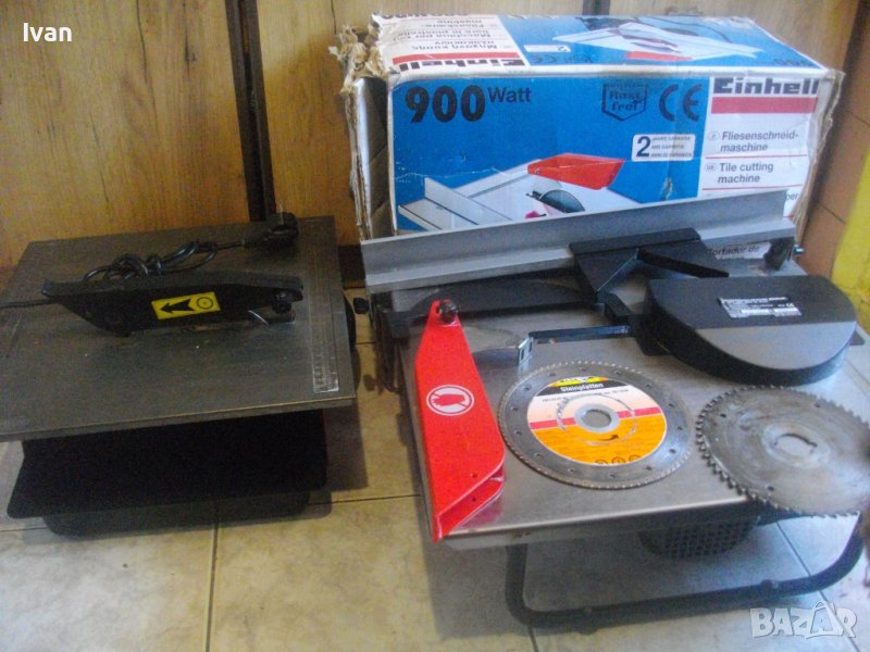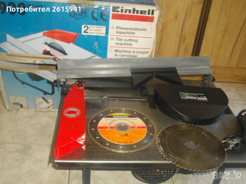 Цена на 900 вата голяма професионална немска ел.машина РЯЗАНЕ ДО 41 мм ДЕБЕЛИНА на плочи/плочки и циркуляр рязане дърва - за дискове размери до ф 200 мм - с налични 2 бр. различни дискове /диамантина и твърдосплавен зъбен за дърва/ - EINHELL - в кашон - с паралел рязане по ширина и приспособление ъглово рязане - 369 лв. НЕ Е НАЛИЧНА.