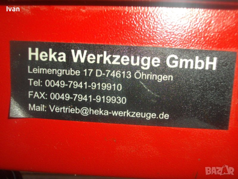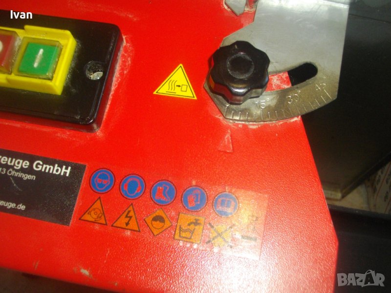 Произовдство - немско оригинално. Произовдител - HEKA Werkzeuge GmbH.Машината е за сухо и моркро рязане на плочи/плочки всякакви без мрамор - фаянс, теракот, гранитогрес, керамика, камъни, гнайс, тротоарни бетонови плочи и др. с дебелина до 33-35 мм. За дискове размер ф 180 мм х 22,2 мм диамантени. Машинате с поставен оригинален немски диск диамантина - почти нов. Налична вана оригинална на машината за вода при мокро рязане. Ъгъл рязане 0-45 градуса. Мощност на мотора - 600 вата, скорост - 2950 об/мин. Метална масивна основа и корпус на машината- Метален плот с размери 390 х 400 мм. Височина на машината с диска - 220 мм.
