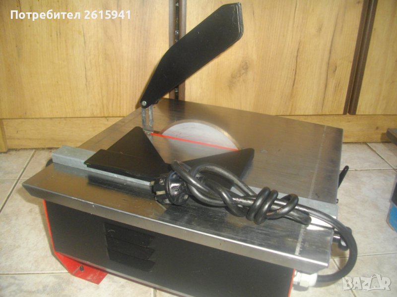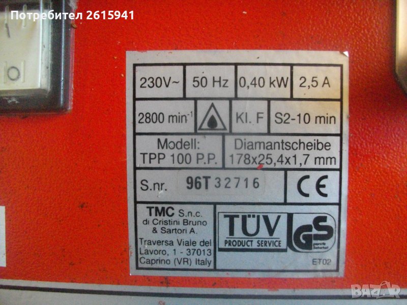 Вписана мощнот на мотора - 0,40 KW, скорост - 2800 об/мин. Защита - 2,5 ампера. За дискове размер ф 178 мм х 25,4 х 1,7 мм. Поставен италиански оригинален диск диамантина - почти нова. S2 - време на работа с 1 пуск - 10 мин. TUV сертификат стикер качество. За сухо/мокро рязане. Без налична вана за вода /може да се ползва всякакъв друг съд с подходящи размери/. Метални основа и корпус. Прот инкс