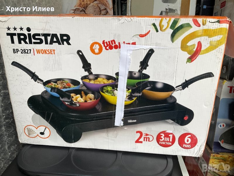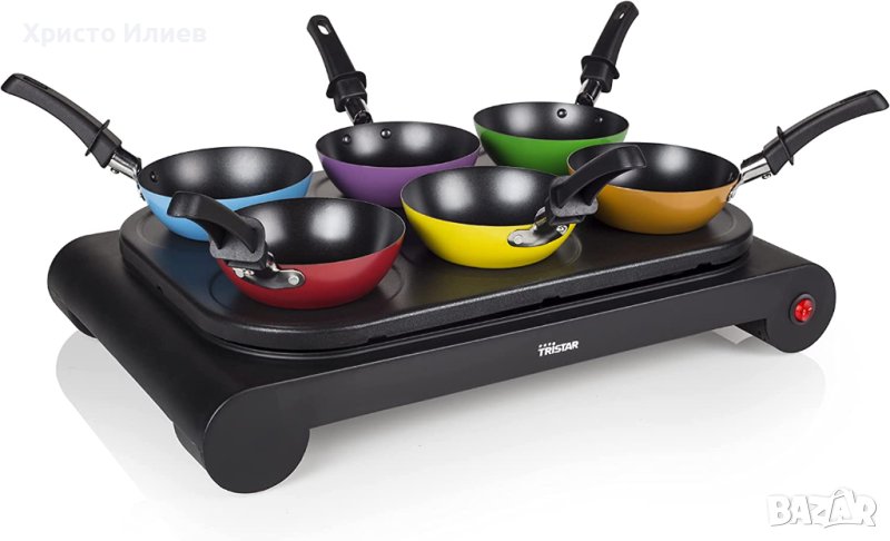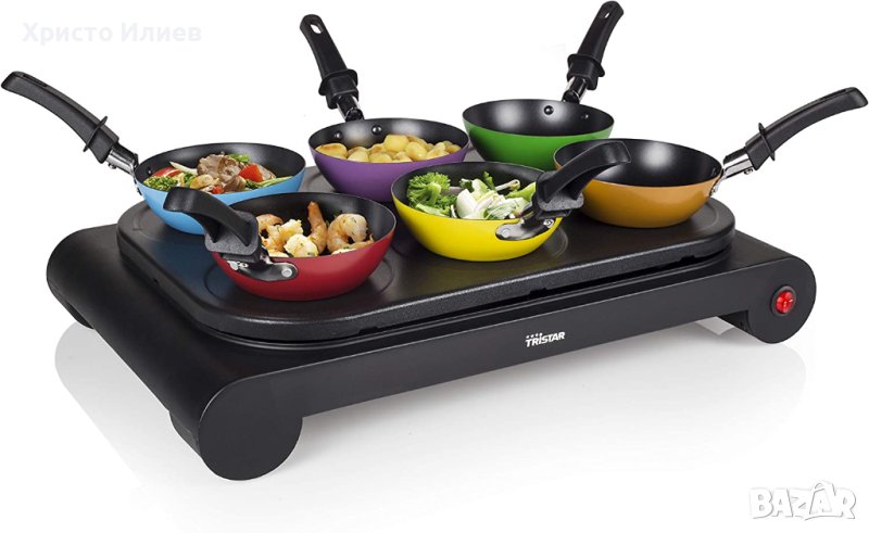 Можете да приготвите най-вкусните уок ястия с парти уок комплекта Tristar с шест души наведнъж. Сервирайки купички с различни видове зеленчуци, месо, риба, фиде или ориз и някои сосове, всеки може да комбинира съставките по свой вкус. Можете също да използвате плочата за печене без уок тиганите и да пържите директно върху плочата. Удобните форми в плочата ви позволяват да печете малки палачинки, палачинки или омлети.