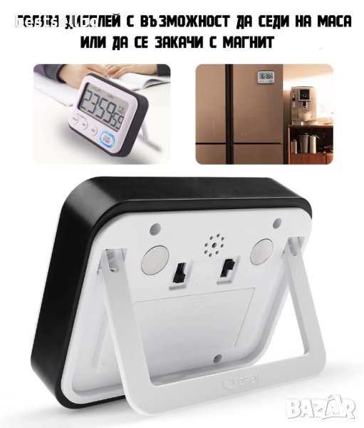 Таймерът е лесен за използване, с функции като превключване между 12-часов и 24-часов формат на времето. Той разполага с големи бутони за удобство при настройките. Можете да го закрепите на хладилника, печката или абсорбатора с помощта на двата силни магнита на гърба или да използвате скритата стойка, която го поставя изправен.