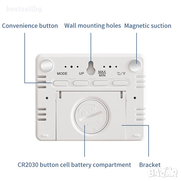 Часовникът предлага възможност за превключване между Целзий и Фаренхайт за удобство при измерване на температурата. С опорна рамка на гърба, той може да бъде стабилно поставен на работния плот или друга повърхност. Ако искате да го поставите на хладилника, магнитният дизайн на гърба го прави лесно закрепящ върху металната повърхност.
