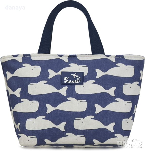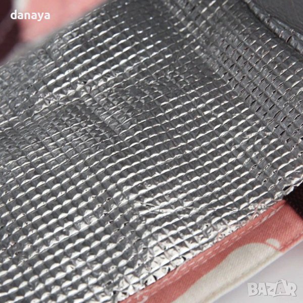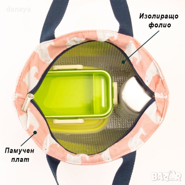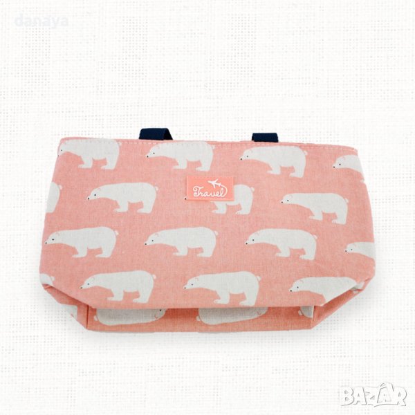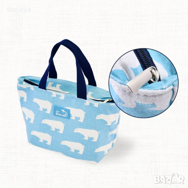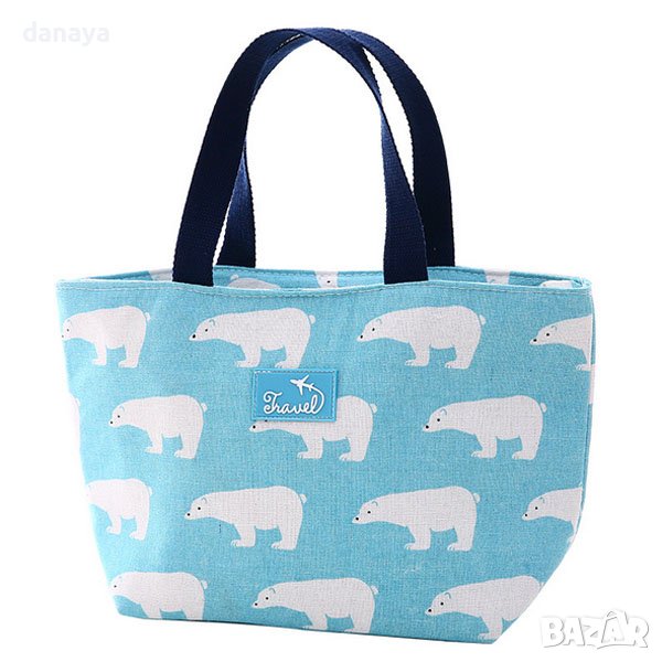 Термо чанта с изолиращо фолио отвътре и удобни дръжки за носене. Външната част е изработена от памучен плат със свеж принт на бели мечки. Чантата е подходяща за храна и напитки. Може да се използва при пътуване, на плаж, на къмпинг, пикник. Задържа храната топла или студена за няколко часа. Затваря се с цип.