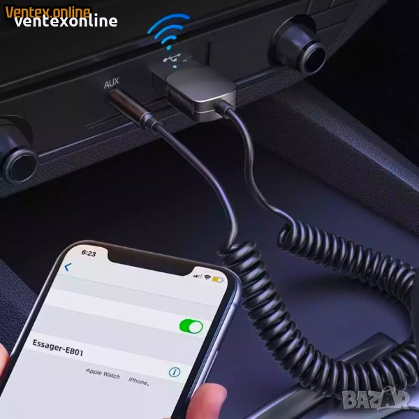 • Essager се свързва към AUX порта на автомобила, другата страна се свързва в USB 5V порт или ако автомобила не разполага с такъв може да се свърже и към зарядно в запалката. Свързването на USB порта служи само и единствено за захранване на блутута, така че да можете да възпроизвеждате музика безжично от вашият телефон. Essager се свързва автоматично, след като вече веднъж е бил свързан към вашия смартфон. АДАПТЕРА НЕ РАЗПОЛАГА С БАТЕРИЯ !!! НЕ Е НУЖНО допълнително захранване или зареждане, което прави много по-голямо удобство и не е нужно да се притеснявате дали ще ви стигне батерията !!! USB-порта се преобразува в bluetooth което позволява използването му също за лаптоп, телевизор или безжична колонка. Устройството разполага с Handsfree система