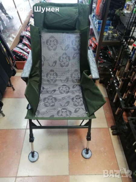МНОГО УДОБЕН РИБАРСКИ СТОЛ СЪС ЗДРАВА ТРЪБНА КОНСТРУКЦИЯ, ИЗРАБОТЕН ОТ КАЧЕСТВЕНИ МАТЕРИАЛИ. Разполага с функция за регулиране на облегалката, възглавница и подлакътници за още по-голям комфорт. Столът е снабден с отваряща и смъкваща се подложка, което го прави много подходящ за по-топли дни. Снабден е с четири регулируеми крака, които могат да се нагласят така, че да стои стабилно на всякакъв терен. Краката му завършват с широки "лапи" против затъване.