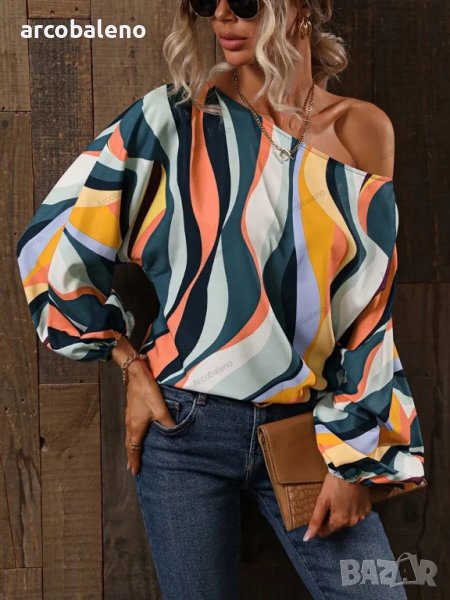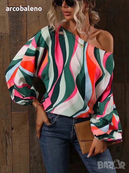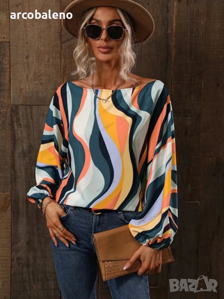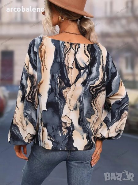 Дамска риза с щампа и свободни рамена с балонени ръкави, 7цвята