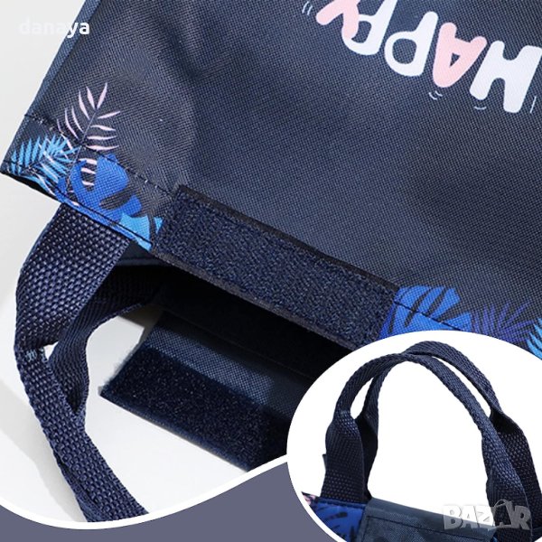 Термо чанта за за обяд, за училище, или за детска кухня с удобни дръжки за носене. Симпатична чанта за храна и напитки с изолиращо фолио във вътрешната си част. С много свеж принт върху всеки модел и вдъхновяващи надписи LOVE YOU, HAPPY DAY, Good Time, LET’S TRAVEL. Чантата се отваря и затваря с велкро лепенка. С удобни дръжки за лесно носене. Компактен размер, супер лека и приятна на допир материя. Чаната е с широко приложение – може да се използва като чанта за детска кухня, чанта за разходки в парка, чанта за съхранение на обяда за училище на детето, на къмпинг, в планината, на плажа и т.н.