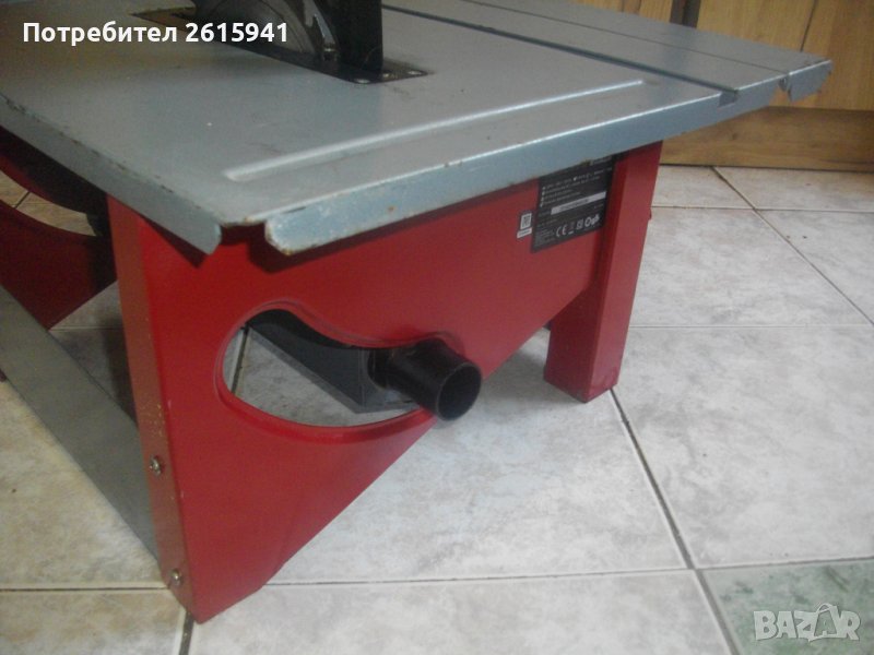 циркуляр Ейнхел. Марка модел - Einhell RT-TS-1221. Произовдител - IBC GbmH Germany - производство - Made in P.R.C. /1/ - регион 1 - за ЕС. Машината е с много запазен външен вид, почти нова ,в отлично техническо/работно съсотяние. Голяма мощност от 1200 вата, 200 к.с. 1 скорост от 4500 об/мин. Височина на рязане до 45 мм, ъгъл рязане 0-45 градуса. За дискове размер ф 210мм х 30 х 2,6 мм.. Поставен оригинален диск на машината с твърдосплавни частици на зъбите - като нов. Основен плот метален с размери 400 х 570 мм, с линеал алуминиев на плота от едната страна, разграфен до 40 см. Втори отварящ се до 20 см на дължина плот, с регулируемо отваряне и метални крака, които се сгъват/разгъват. Наличен оригиналният капак над диска с конектор за отпадъчен прах, на който се скачва маркуч на строителна прахосмукачка.Височина на машината от земята без диска - 30 см, с диска и капака над диска - 44 см. Предни пускови бутони в конзола кутия със защитен капак над бутоните - антипрахов. Ноличен на конзолата бутон рестарт. Тегло на машината - 15,5 кг. Цена - 399 лв.