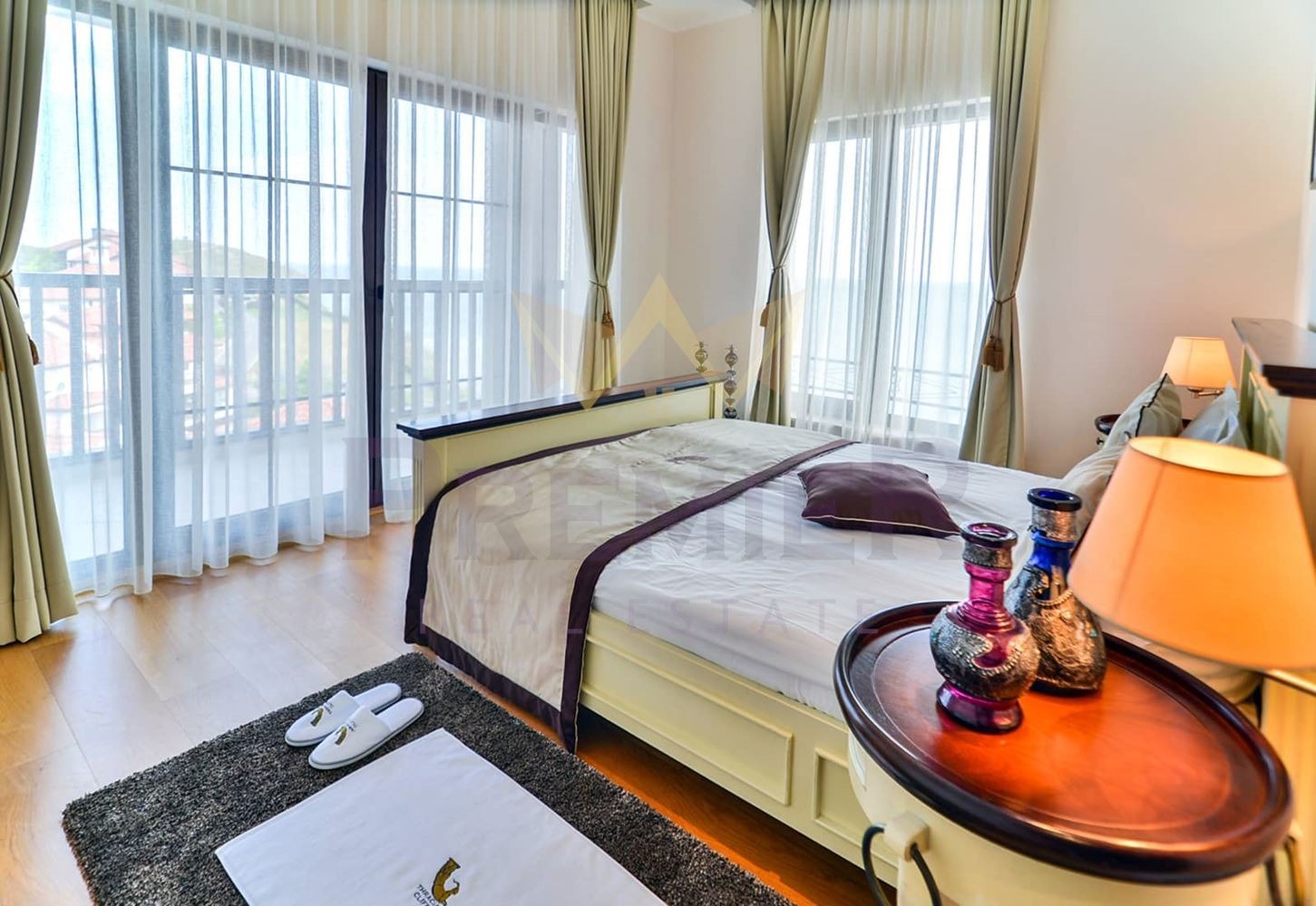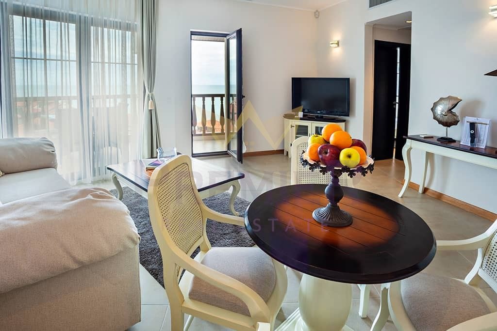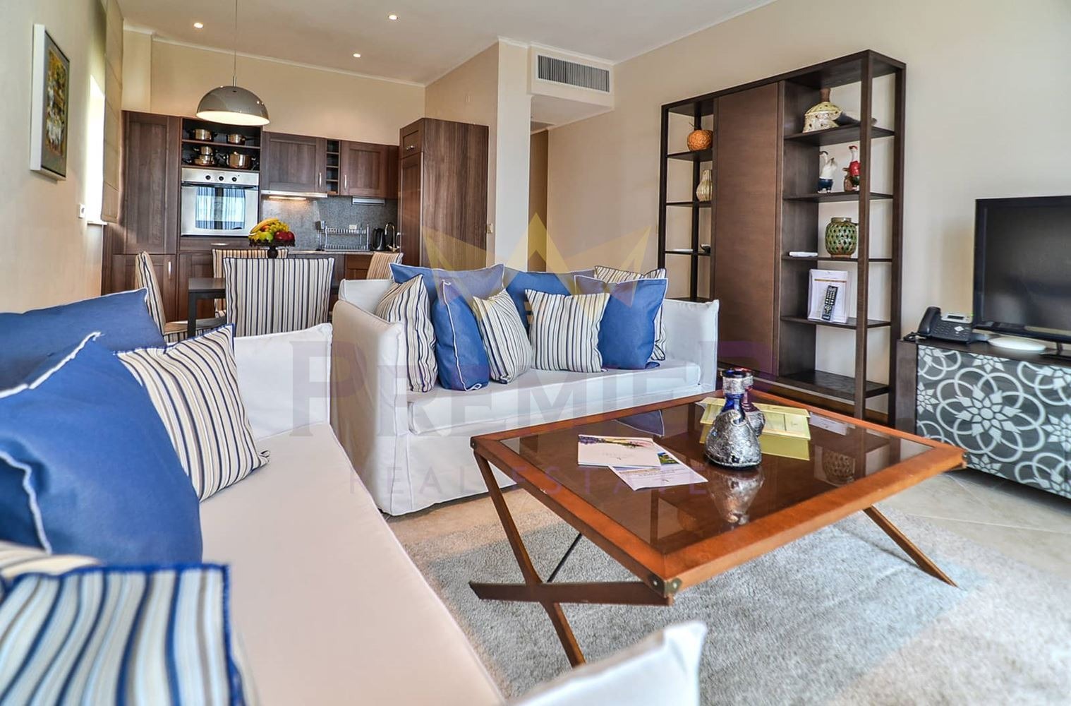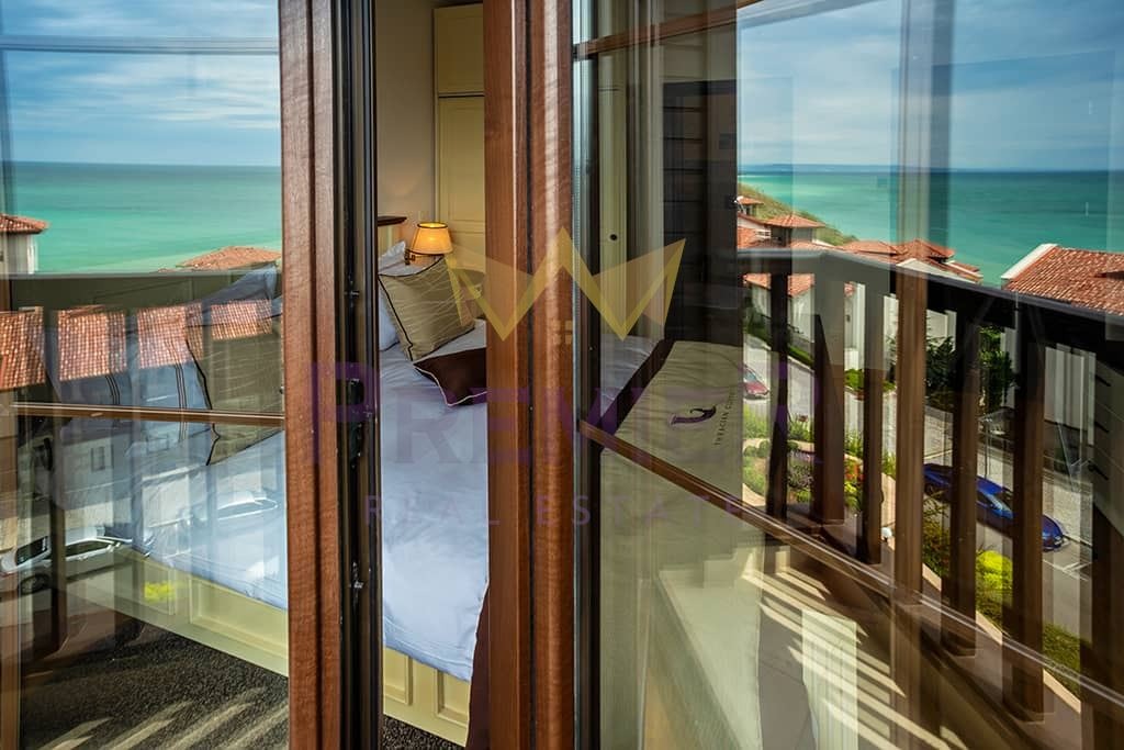 Изисканият апартамент е проектиран да предоставя широко пространство с големи и светли помещения. Цялостният интериор и обзавеждане се отличават с високо качество - стандарт за луксозният комплекс. Панорамната тераса предоставя незабравима гледка към обширните зелени голф игрища и морска панорама. За Вашето удобство жилището е оборудвано с мулти сплит климатична система, Wi-Fi интернет, телефон, пожарна и охранителна системи, както и много други услуги, които да направят ежедневието Ви приятно.