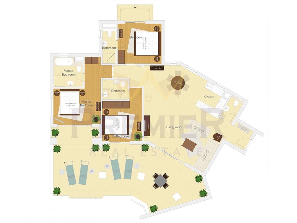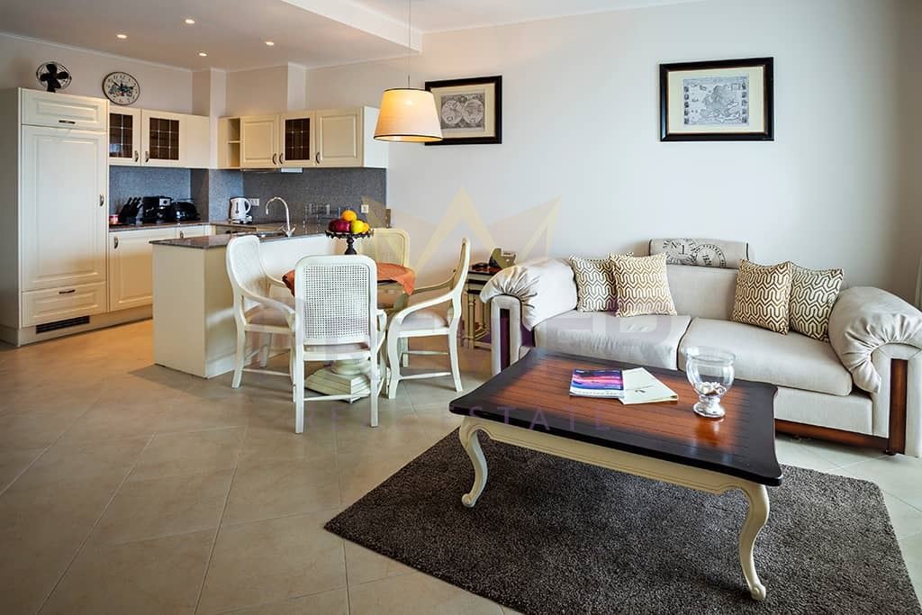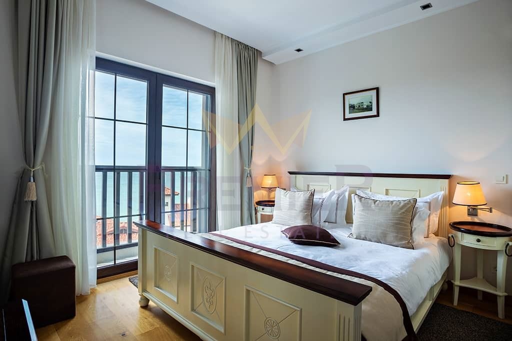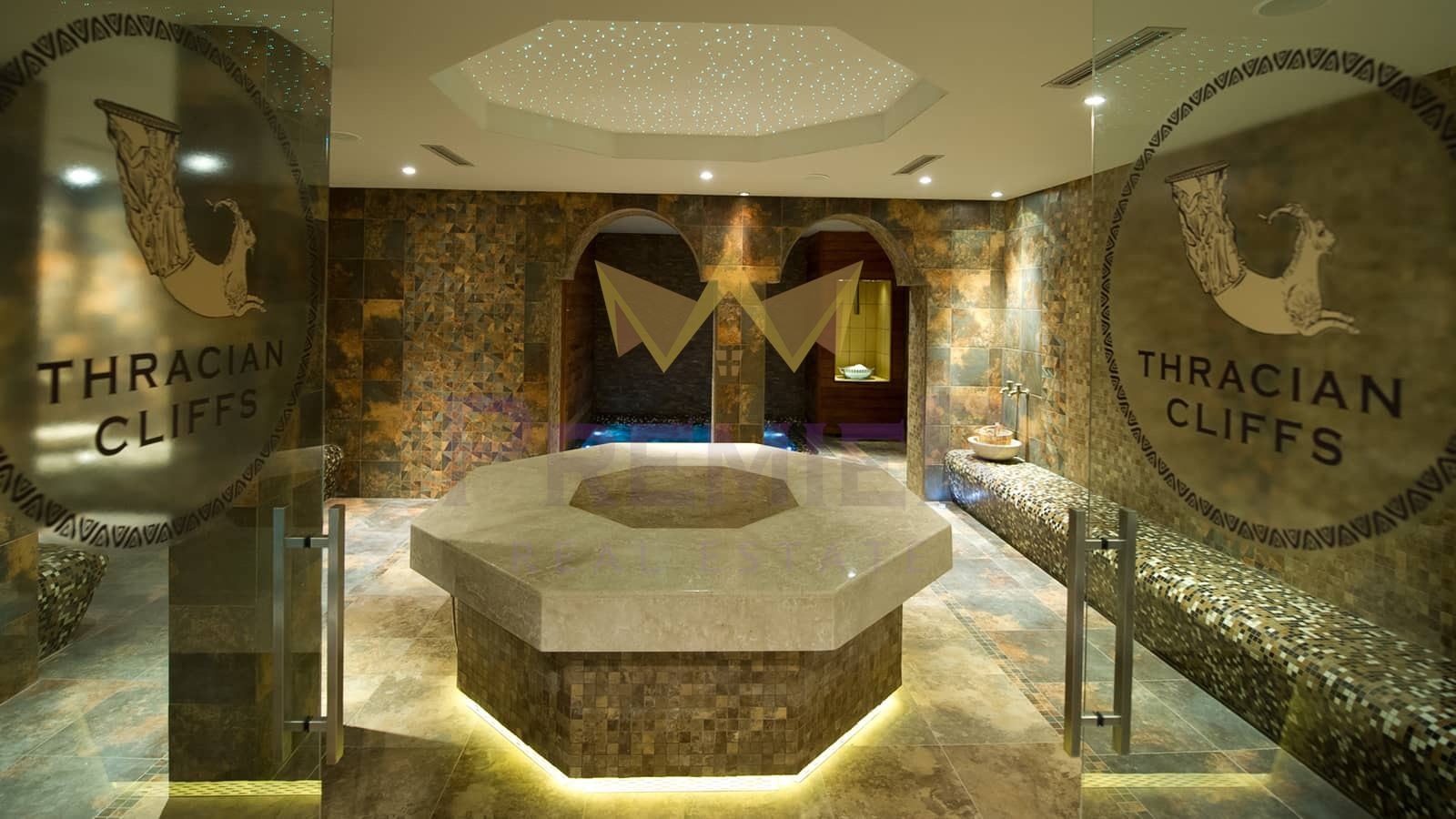 Изисканият апартамент е проектиран да предоставя широко пространство с големи и светли помещения. Цялостният интериор и обзавеждане се отличават с високо качество - стандарт за луксозният комплекс. Панорамната тераса предоставя незабравима гледка към обширните зелени голф игрища и морска панорама. За Вашето удобство жилището е оборудвано с мулти сплит климатична система, Wi-Fi интернет, телефон, пожарна и охранителна системи, както и много други услуги, които да направят ежедневието Ви приятно.