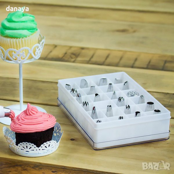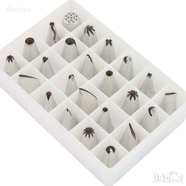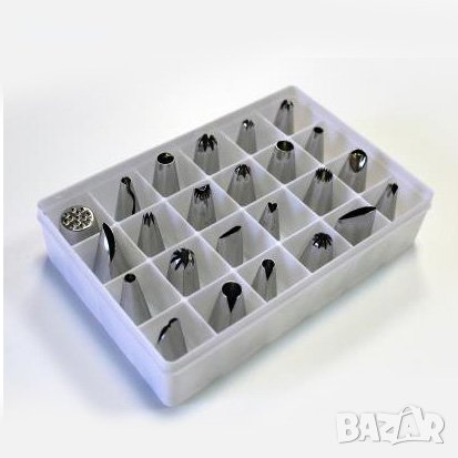 Комплект сладкарски накрайници за пош за крем. 24 броя, различни видове накрайници, в пластмасова кутия. Накрайници за шприц за декорация на торти и сладкиши. Може да се комбинират с пош за еднократна или многократна употреба.