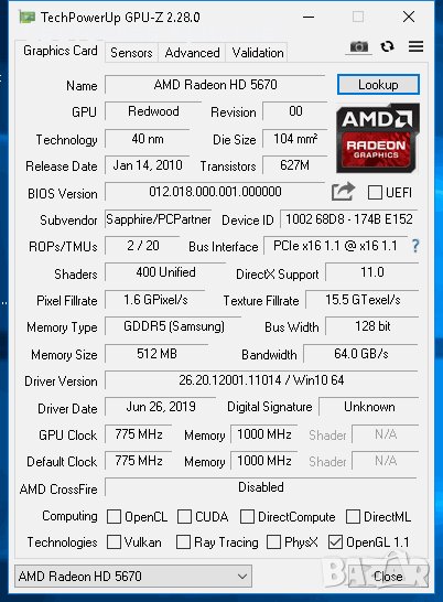 Продавам видео карта AMD Sapphire HD5670 512M 128bit GDDR5 HDMI DVI DP PCI-E
