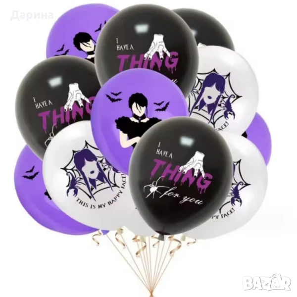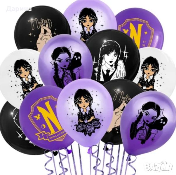 Парти сет Wednesday - състои се от 6бр. фолиеви балона: 1бр. Wednesday 58,5/84,5см., 1бр. ръка 53/63см., 4бр. кръгли балони с 2 лица 42см. - 25лв./12.78€. Латексови балони Wednesday - 12бр. (30см) + цифра от 3 до 10г. - 20лв./10.23€. Банер Happy Birthday 16/20см. - 15лв. /7.67€. Покривка Wednesday 108/180см - 9лв./4.60€. Покани 11/14см 10бр. - 12лв./6,14€ Латексови балони к-т от 10бр. в цвят лилаво/черно - 5лв./2.56€. Фоторамка Сърце с цифра от 2 до 9г. - 12лв./6.14€. / вкл. ф.балон сърце 100/40см., цифра 20/40см., черна панделка и стикери./ Нови.