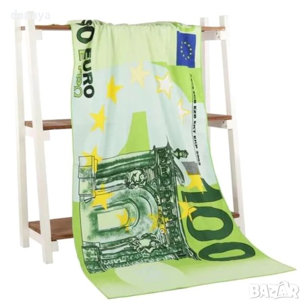 Плажна хавлия 100 EURO. Кърпа за плаж изработена от качествен бързосъхнещ микрофибър. Плажната кърпа не задържа ситния пясък. Може да се пере в пералня до 40 градуса. Ултра лека и удобна при пътуване. Супер мека и приятна на допир. Размери 70х150см. Хавлия за плаж с принт на банкнота от 100 euro.