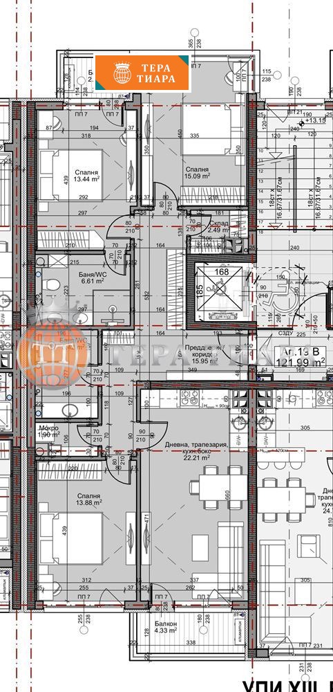 Агенция ТЕРА ТИАРА продава БЕЗ КОМИСИОННО ЧЕТИРИСТАЕН апартамент в новостроящата се сграда, разположена в полите на Витоша в кв. Младост 4. Жилището се намира на 5 етаж от девет и е с функционално вътрешно разпределение на площ от 141,26 кв.м. (застроена площ 122,14 кв.м. + 19,12 кв.м. общи части) и се състои от Дневна с кухня и трапезария ( 22,21 кв.м.), Спалня ( 13,44 кв.м.) със собствена Баня с тоалетна ( 6,61 кв.м.), втора Спалня ( 15,09 кв.м.), трета Спалня ( 13,88 кв.м.), втора Баня с тоалетна ( 5,42 кв.м.), Мокро помещение ( 1,9 кв.м.), Складово помещение, Преддверие и два Балкона. Изложение: Югоизток / Северозапад. Отопление: ГАЗ. За удобството и комфорта на бъдещите собственици, в сградата има възможност за покупка на подземни и надземни гаражи и паркоместа, на цени от 17000 евро до 48000 евро, осигурено е видеонаблюдение и контрол на достъпа. Очакван Акт 16 ноември 2026 годината. Апартаментът може да бъде разделен на ДВА ДВУСТАЙНИ апартамента.