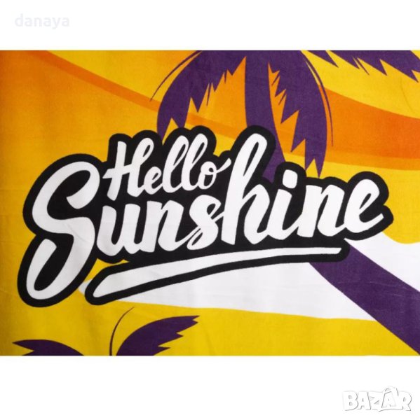Плажна хавлия в свежи ярки цветове с принт на залез с палми и летен надпис “Hello Sunshine”. Изработена е от качествен бързосъхнещ микрофибър. Плажната кърпа не задържа ситния пясък. Може да се пере в пералня до 40 градуса. Ултра лека и удобна при пътуване. Супер мека и приятна на допир. Размери 70х150см. Хавлия за плаж със супер свеж летен дизайн.