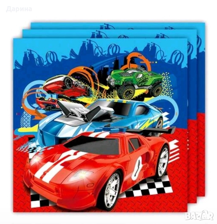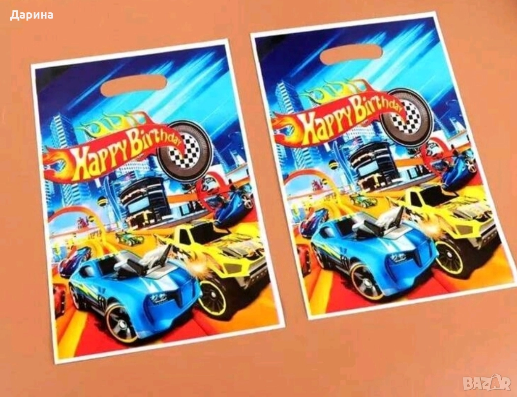 Винил 100/150см. - 30лв./15,34€. Парти сет балони колите Hot wheels 11бр. - 25лв./12,78€ - 2бр. кръгли балони с 2 лица 45см., 2бр. звезди 45см., 6бр. латексови балони, 30см. и 1бр. цифра 80см. от 1 до 9г. Покривка 108/180см. - 9лв./4,60€. Банер ,,Happy Birthday" - 15лв./7,67€. Латексови балони колите Hot Wheels к-ти по 10бр. - 13лв./6,65€. Фолиев балон ,,Спортна кола" 110/52см. - 7лв./3,58€. Салфетки 20бр. - 5лв./2.56€. Торбички 16/25см. 10бр. - 4лв./2.05€.