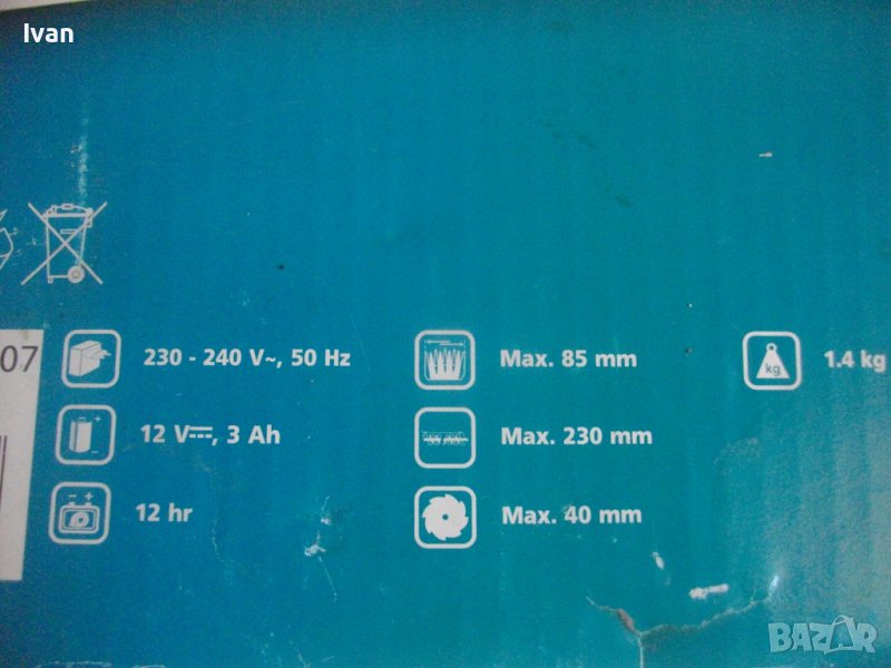 Батерия - 12 волта, 3,0 ампера. Не е упоменат състав на елементите. Време на зареждане на акумулатора - 12 часа. БАТЕРИЯТА Е ЛОША - НЕ СЕ ЗАРЕЖДА С АДАПТЕРА.