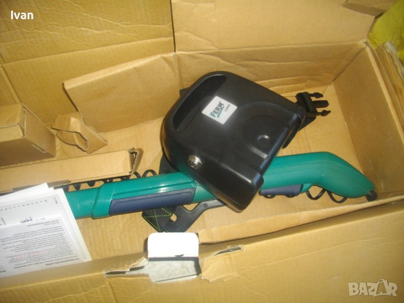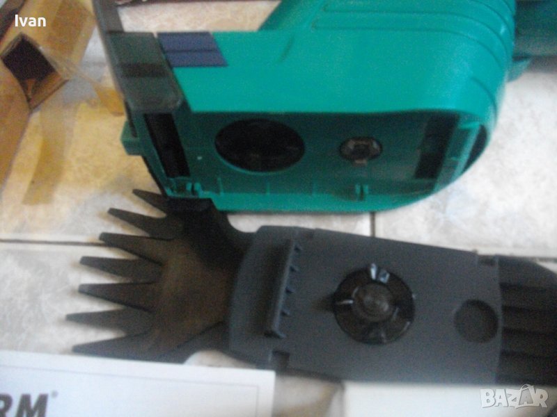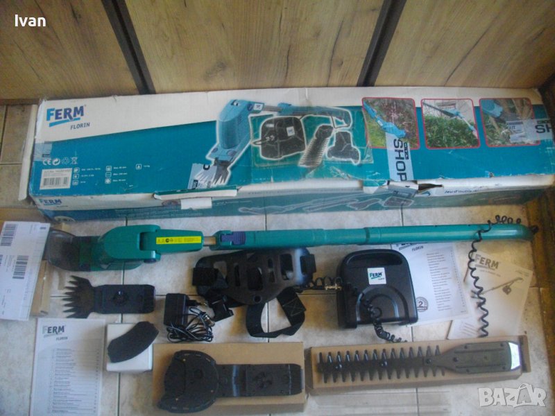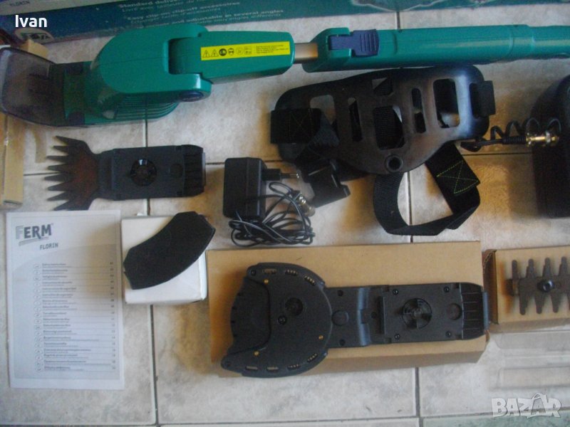 Съвсем нов, неизползван и неупотребяван акумулаторен 12 волтов градински инструмент с различни приставки - храсторез, ножица за жив плет и ножица за подрязване.