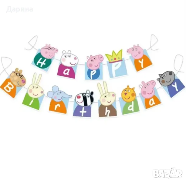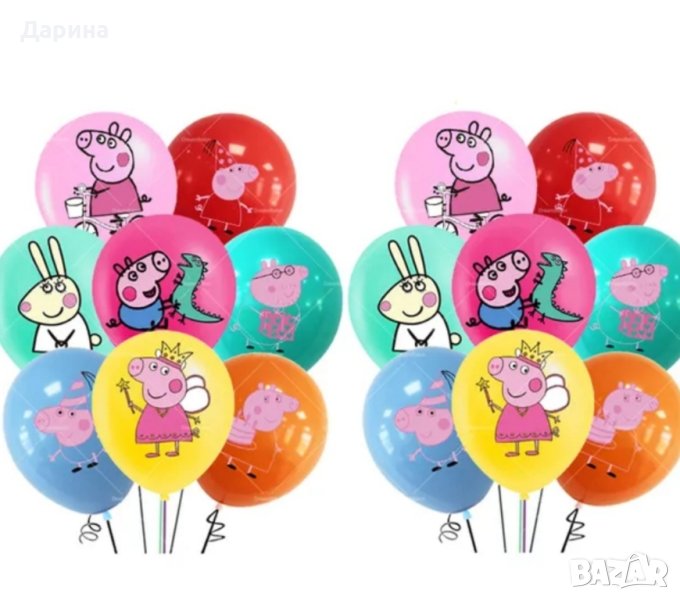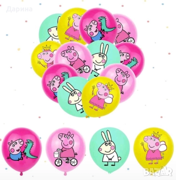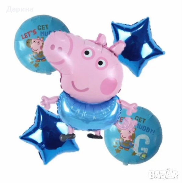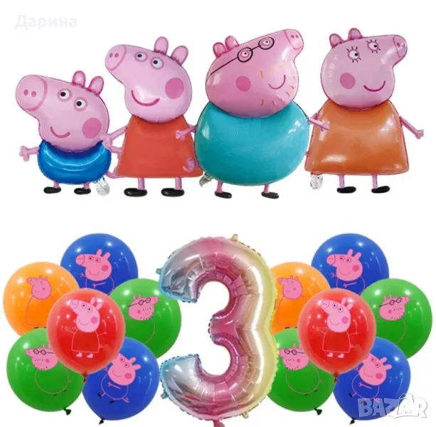 Парти сет Пепа Пиг - 17бр. балони 40лв. /20.45€. Сета се състои от: 1бр. Пепа Пиг 40/70см., 1бр. Джордж 40 /50см., 1бр. мама Пиг 60/72см., 1бр. татко Пиг 58/80см., 12бр. латексови балони 30см. и 1бр. цифра 80см. от 1 до 5г. Парти сет ,,Пепа Пиг" от 2 до 5г. Състои се от 1бр. голям фолиев балон Пепа пиг, 2бр. фолиеви звезди, 2бр. кръгли балона и 1бр. цифра (80см). - 25лв./12.78€. , латексови балони к- ти по 8бр. - 10лв./5.11€. Банер ,,Happy Birthday" - 15лв./7.67€. Покривка 108/180см. - 9лв./4.60€. За повече информация може да посетите нашия сайт www.partykids.fun