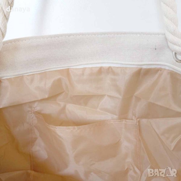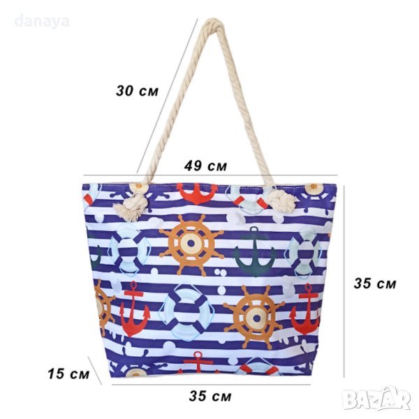 плажна чанта на сини райета и морски мотиви. Чантата може да побере всичко необходимо за плаж. Здрави дръжки тип корабно въже. Изработена от здрав плат, затваря се с цип. Във вътрешната си страна има малко джобче за поставяне на телефон или други малки аксесоари.