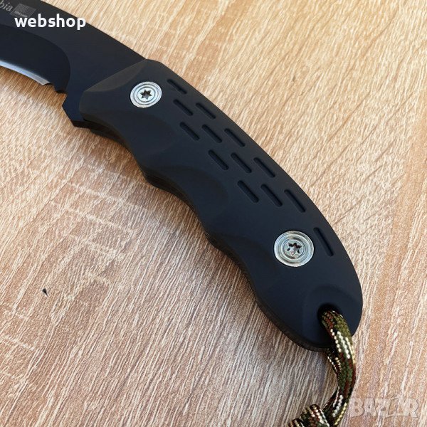 Неговата дръжка от полимер предлага не само издръжливост, но и комфорт с омекотена повърхност, осигурявайки ви здрав захват. С връзка за китка, можете да бъдете сигурни, че ножът ще остане стабилен в ръката ви дори по време на интензивни дейности.
