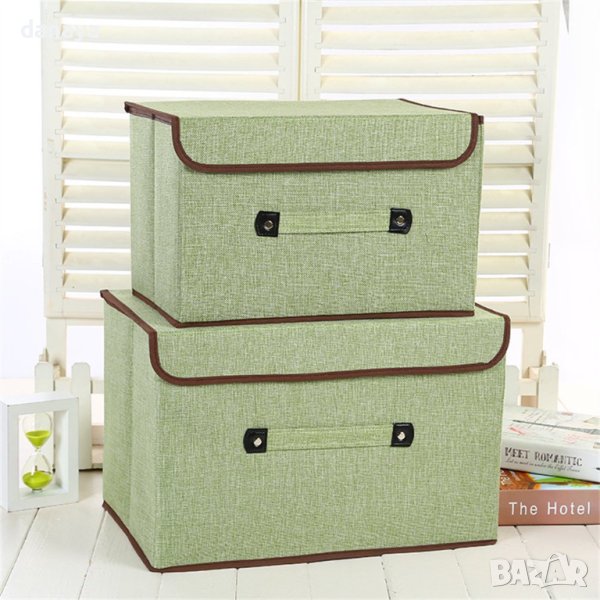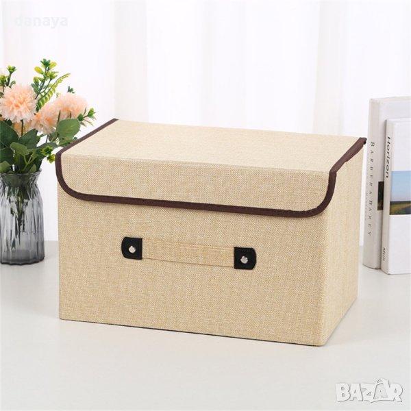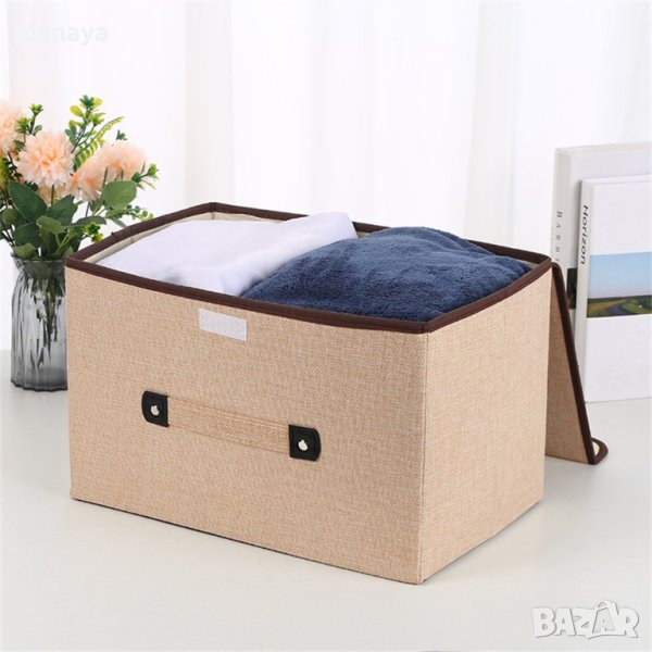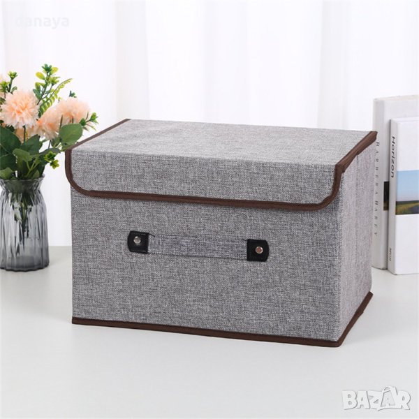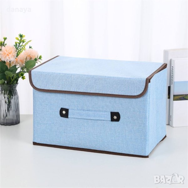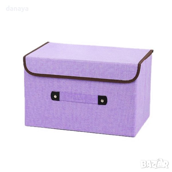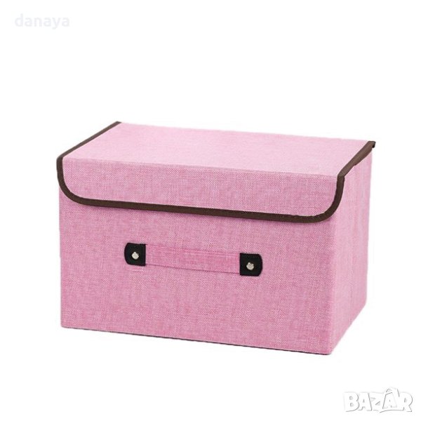 Текстилна сгъваема кутия за съхранение на дрехи и аксесоари. Чудесен органайзер за гардероб с широко приложение – може да се използва като кутия за съхранение на канцеларски материали, ученически пособия, козметични продукти, спално бельо, дрехи, които са извън сезона и т.н. Компактен размер, кутията може да се сгъва и не заема почти никакво място в сгънато положение. Това позволява да се използва и при пътуване.