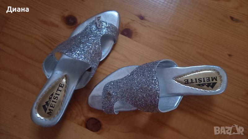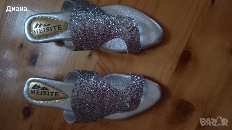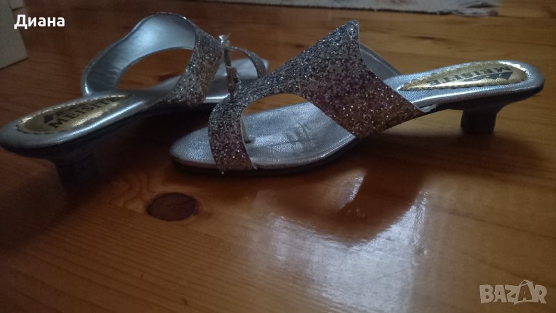 Изключително ефектни брокатени летни чехли, сребрист блясък, особено на слънце или в нощно заведение. Ток със средна височина, стелка 25см.