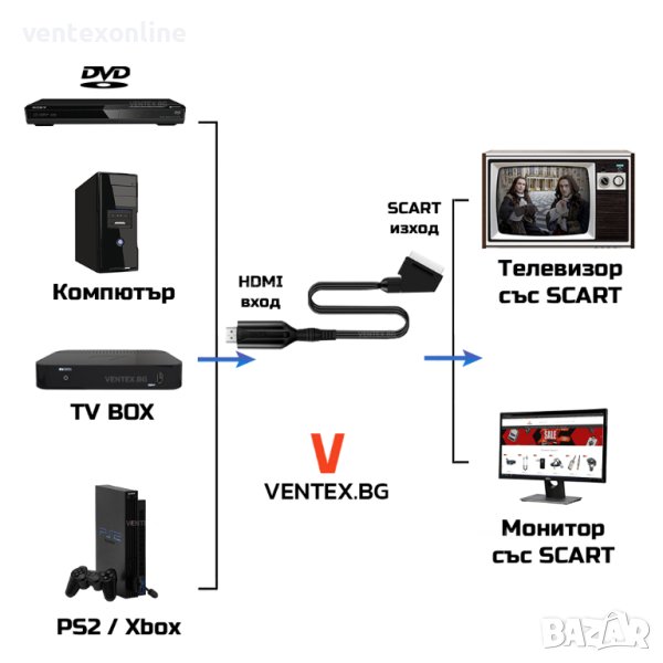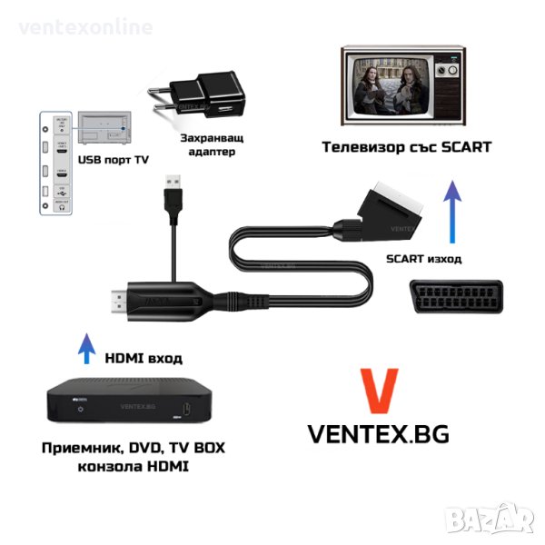 ключови думи: телевизор ,tv към dvd , тв , интерфейс , проектор , ps2 , xbox , монитор , adapter , DVD , ДВД ,TV BOX , SCART , HDMI , скарт , хдми, преобразувател хдми към скарт, хдми цифров приемник към телевизор, тв бокс към хдми, hdmi към scart