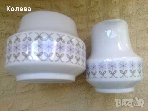 - два съда /захарница и каничка/. Каничката е със счупена дръжка. Размери: Захарница ширина 10,5 см, височина 8,5 см. Може да се