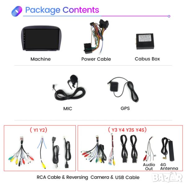 Пълен комплект с цялата рамка, преходни кабели и букси, декодери, предназначени и съвместими за монтиране на конкретния модел автомобил.