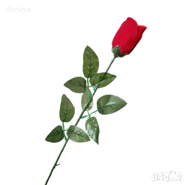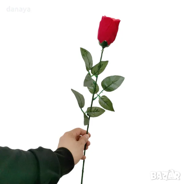 Изкуствена червена роза, прибран цвят. Изкуствено цвете с пълна дължина 65см. Изкуствена роза, подходяща за аранжировка и декорация. Розите, подредени и поставени във висока ваза стоят много ефектно като букет. Цената е за 1 брой стрък.