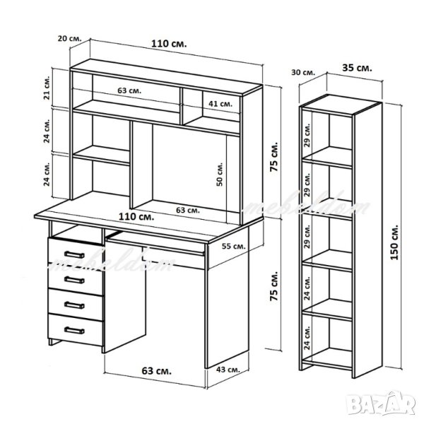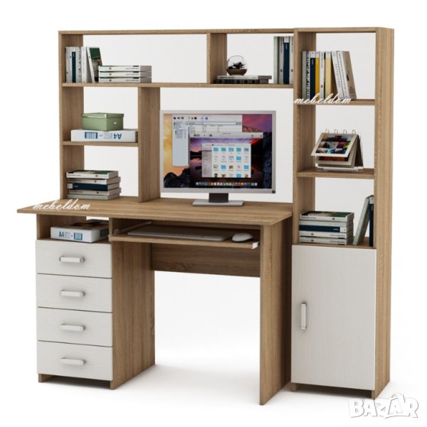 Бюро 110см. с надстройка,4 чекмеджета,клавиатура и етажерка с плавна врата(код-0914)