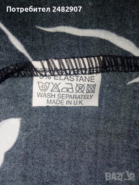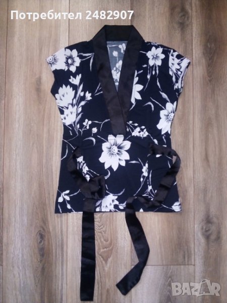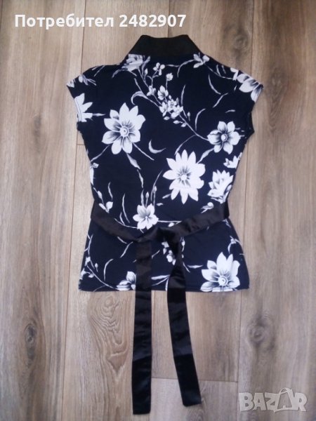 Елегантна дамска блуза в черно и бяло с нежни флорални мотиви, сатенен колан и сатенено деколте. Съдържа 95 % полиестер и 5 % еластан. Ширина в раменете - 35 см, ширина под мишниците - 40 см, дължина от рамото до долу - 55 см, дължина на ръкава от рамото - 7 см. Обличана е веднъж за повод, без забележки.