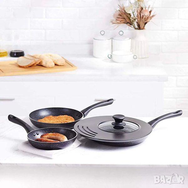 Съдържание на доставката: 20 см, 24 см и 28 см тигани с универсален капак