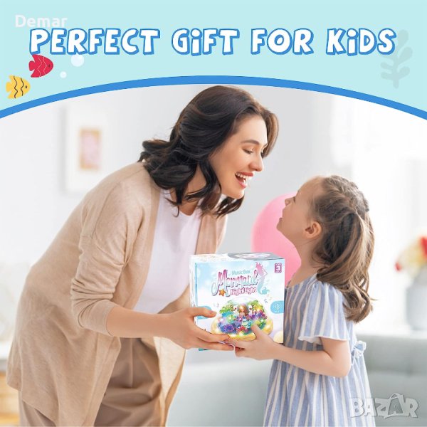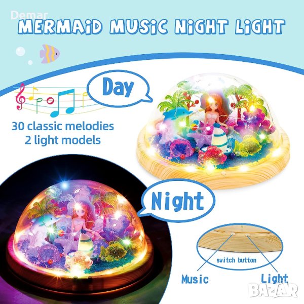 Нашата нощна лампа русалка работи не само като декорация за занаяти, но и като нощна лампа и музикална кутия. Просто използвайте бутона в основата, за да управлявате светлината и музиката, създавайки успокояваща среда, която насърчава релаксацията и съня. Нека нашата нощна лампа внесе нотка магия в стаята на вашето дете и направи лягането лесно.