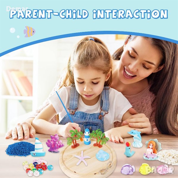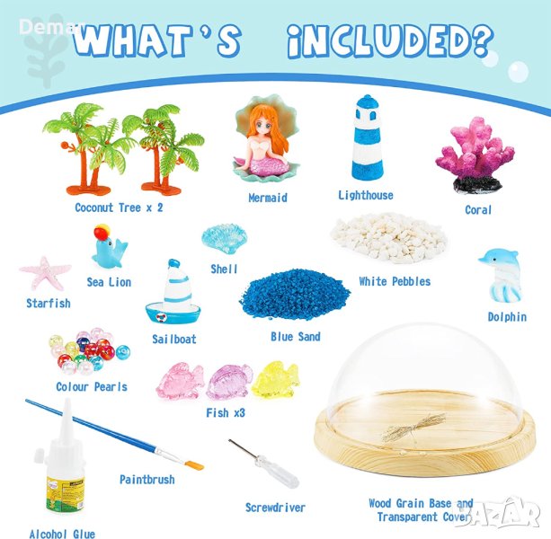 1 x Дървесна основа и прозрачно покритие, 1 x Русалка, 1 x Четка за рисуване, 1 x Алкохолно лепило, 1 x Син пясък, 1 x Бели камъчета, 1 цветни перли, 2 x Дървета, 3 x Риби, 1 x Корали, 5 x Морски животни, 1 х Фар, 1 х Инструкция. AAA батерии не са включени.